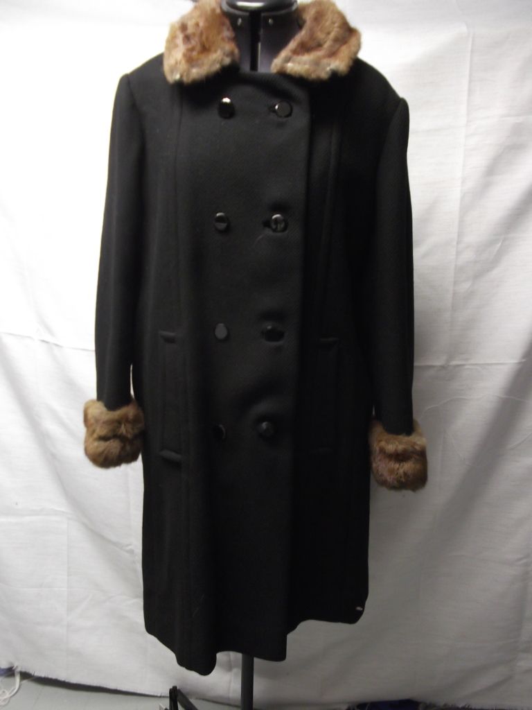 Heavy faux fur collar and cuffs. Double-breasted.; Chest-44; Waist-44; Hips-50; Length-37