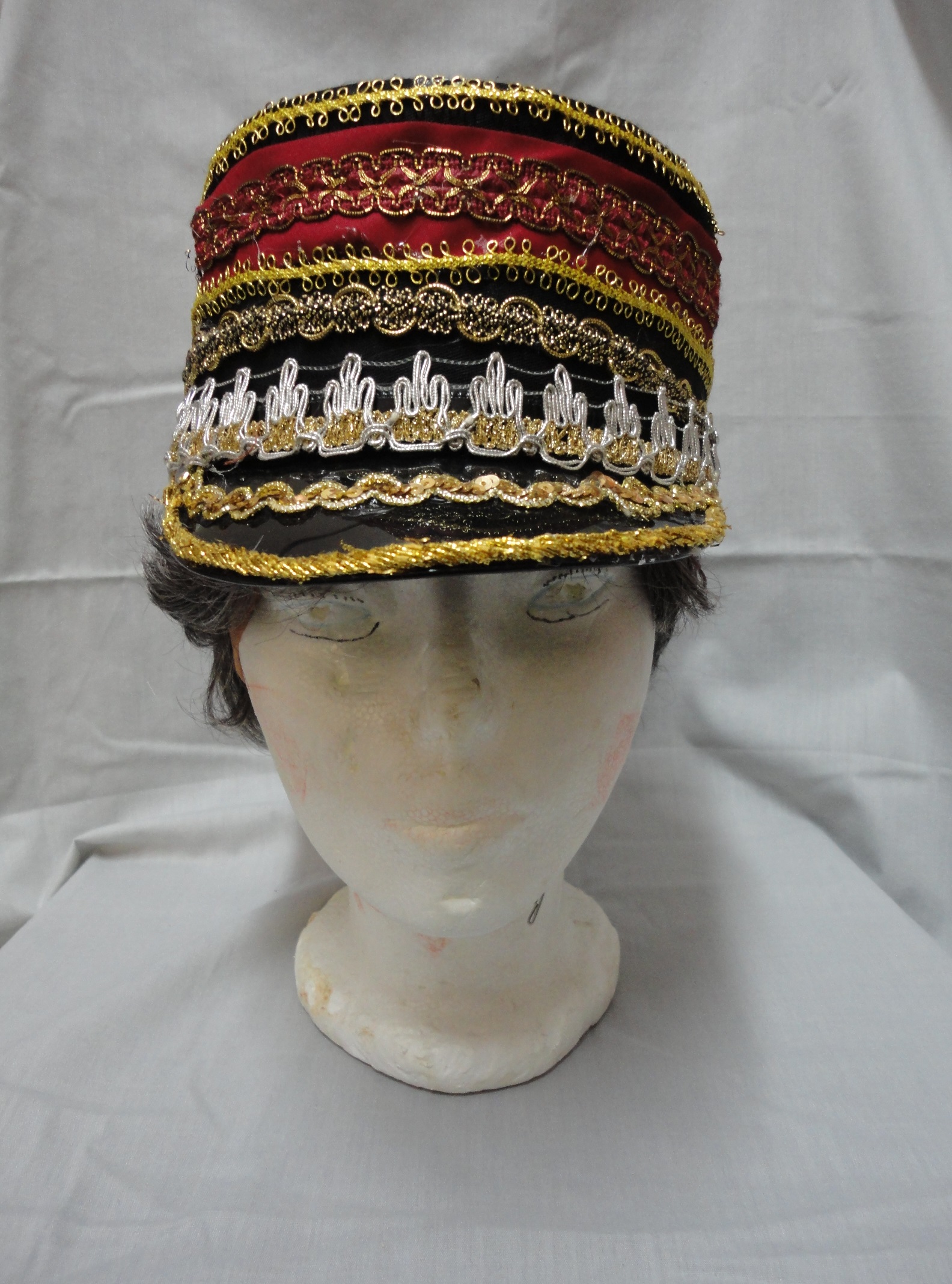 Black, gold, and red; Black decorated officer hat with gold and red trim.; Head Size-24; Hat Size-XL