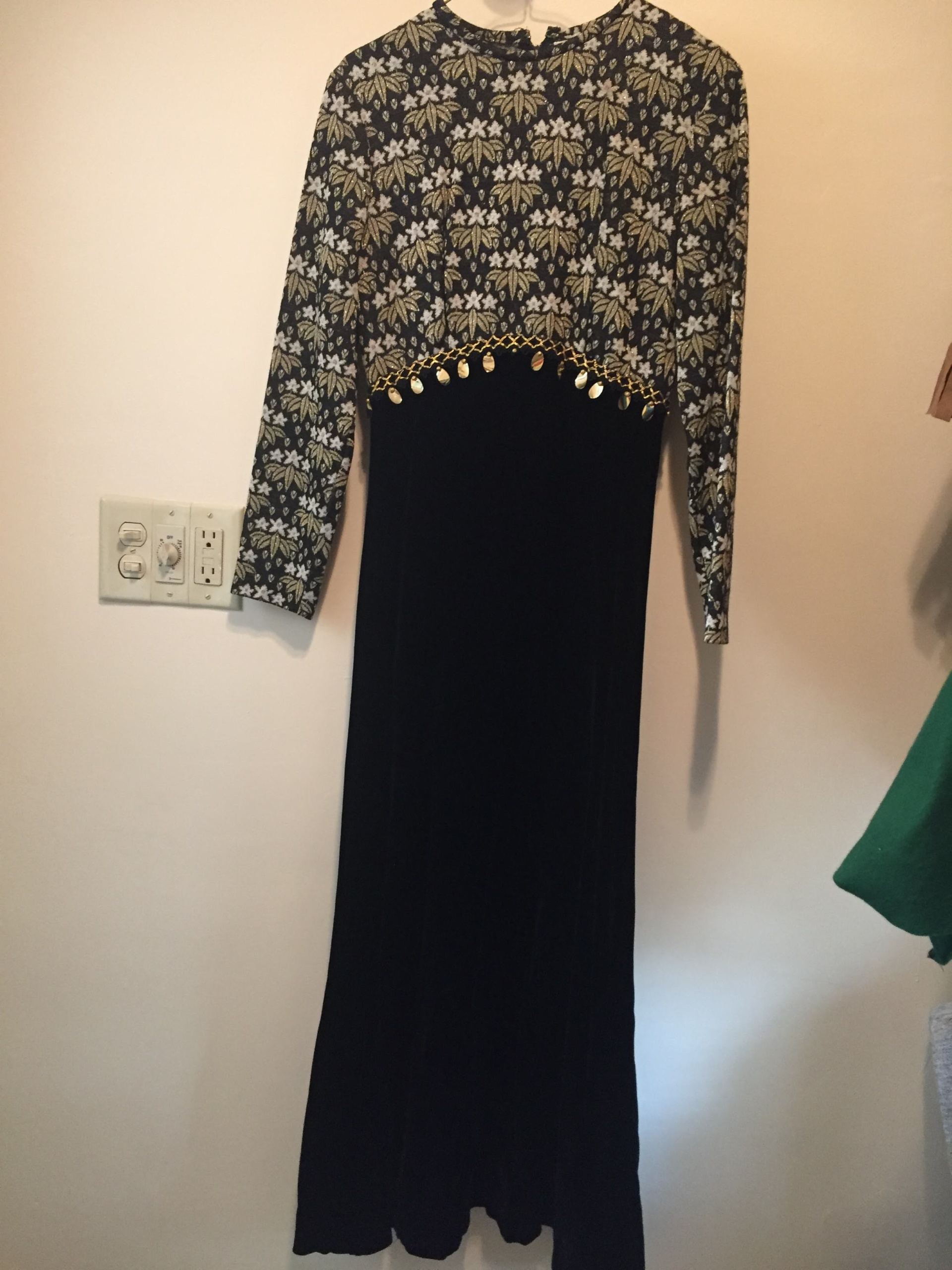 LS gold flowered top, velvet skirt; Chest-36; Waist-28; Hip-36; Length-54