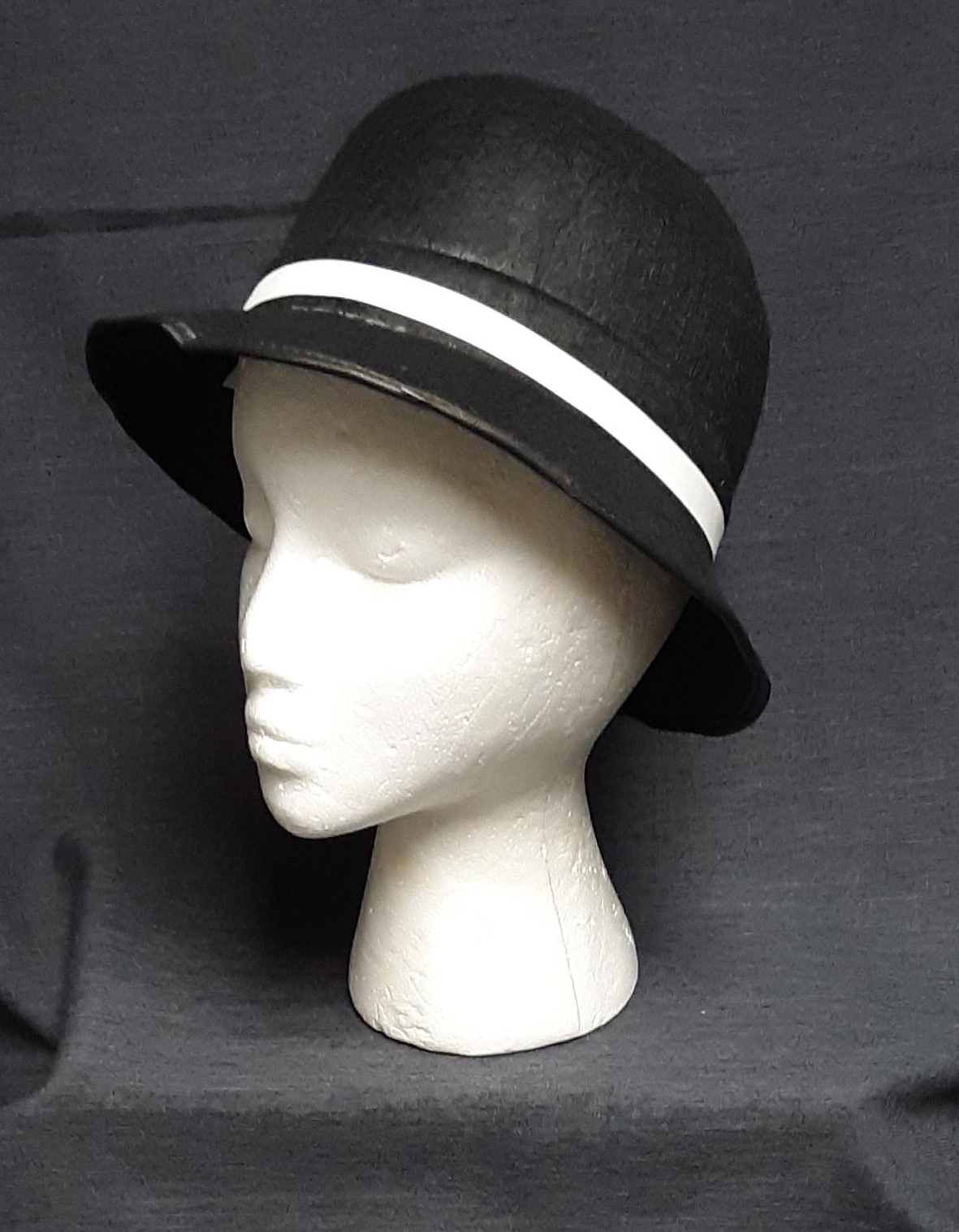 Black; Permafelt dome style black hat with white band; Head Size-22; Hat Size-M