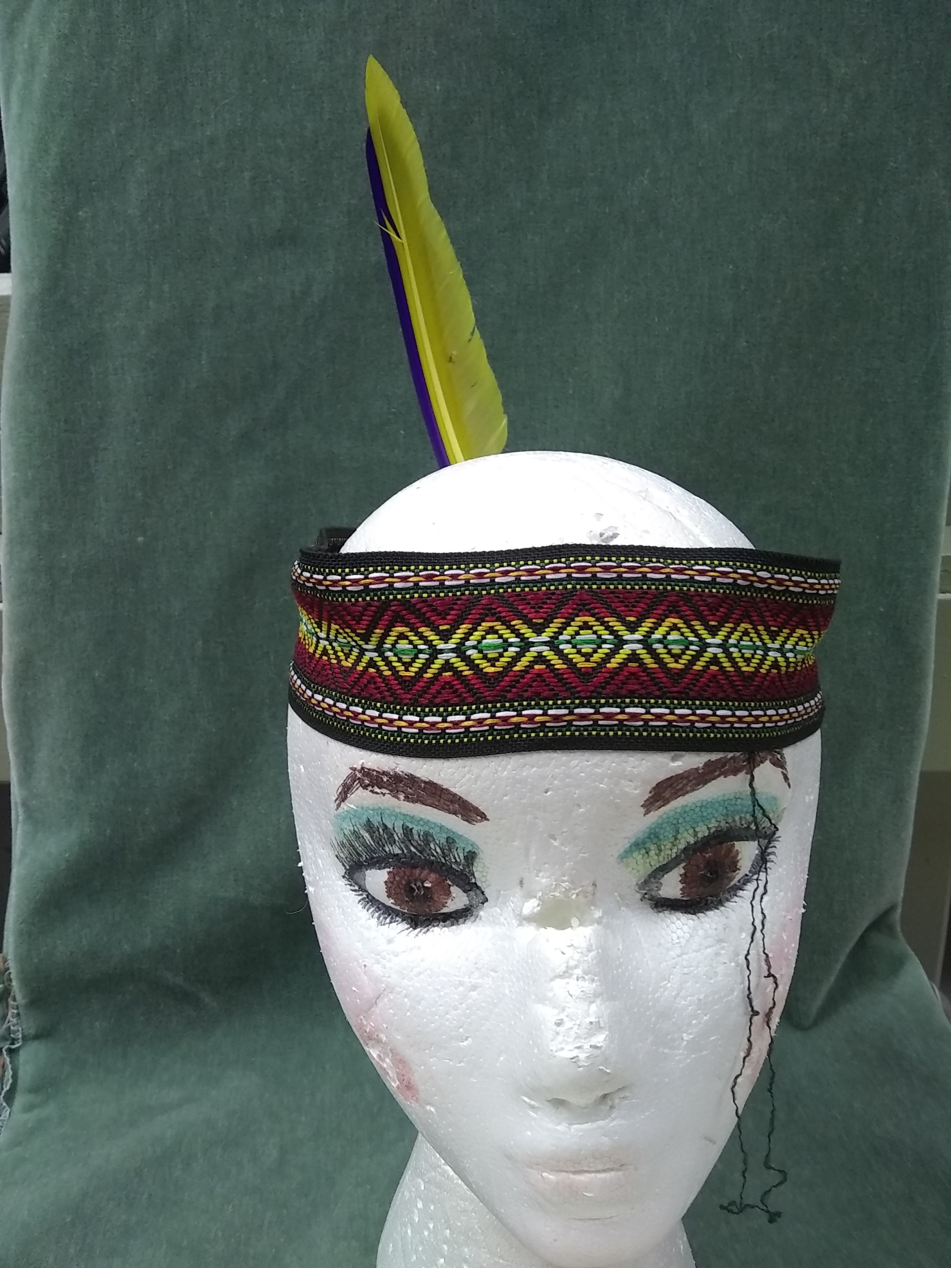 Black, red, and yellow; Tapestry headband with feathers.; Head Size-One Size Fits All; Hat Size-One Size Fits All