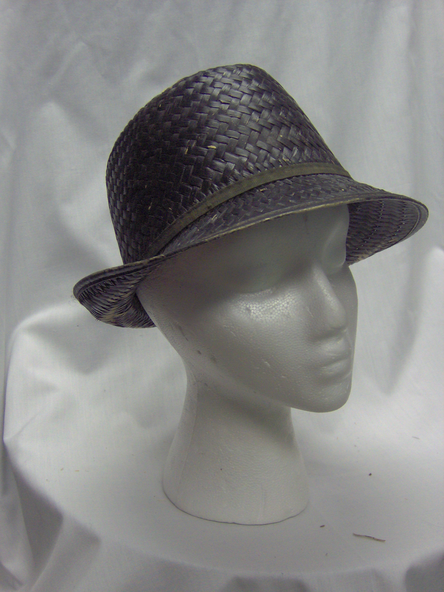 Black; Straw fedora hat painted black with green fabric band; Head Size-21.5; Hat Size-M