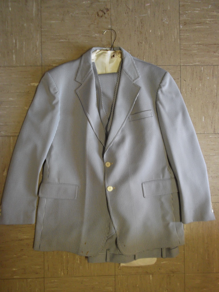 Jacket, vest, pants; single-breasted; Striped; Size-46; Coat Chest-48Coat Waist-46; Coat Hips-48; Coat Length-33; Vest Chest-46; Vest Waist-44; Pants Waist-48; Pants Hip-40; Pants Length-33