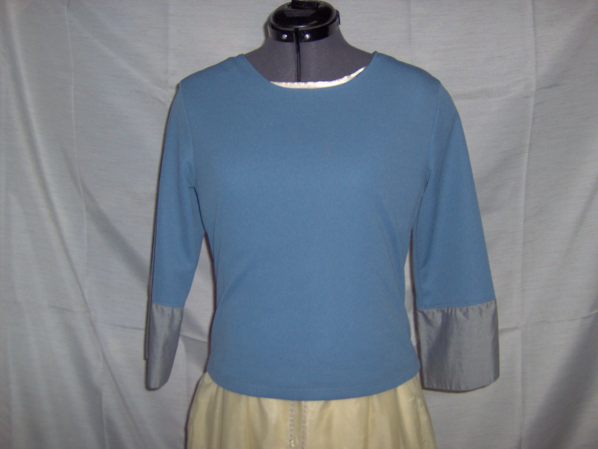 Blue top (round neckline–straight) with grey cuffs on long sleeves.; Bust-34; Waist-32; Hips-; Length-21; Sleeve Length-18