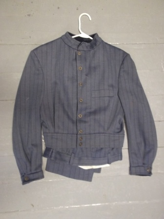 Pinstripe short jacket and pants. Jacket buttons up to the stand-up collar.; Size-38; Coat Chest-40; Coat Waist-32; Coat Height-N/A; Coat Length-21; Pants Waist-30; Pants Length-29