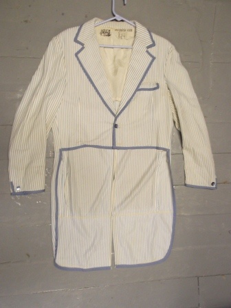 Light jacket. Striped tailcoat has solid blue trim around all outside edges.; Size-44; Coat Chest-46; Coat Waist-40; Coat Height-N/A; Coat Length-39; Pants Waist-N/A; Pants Length-N/A