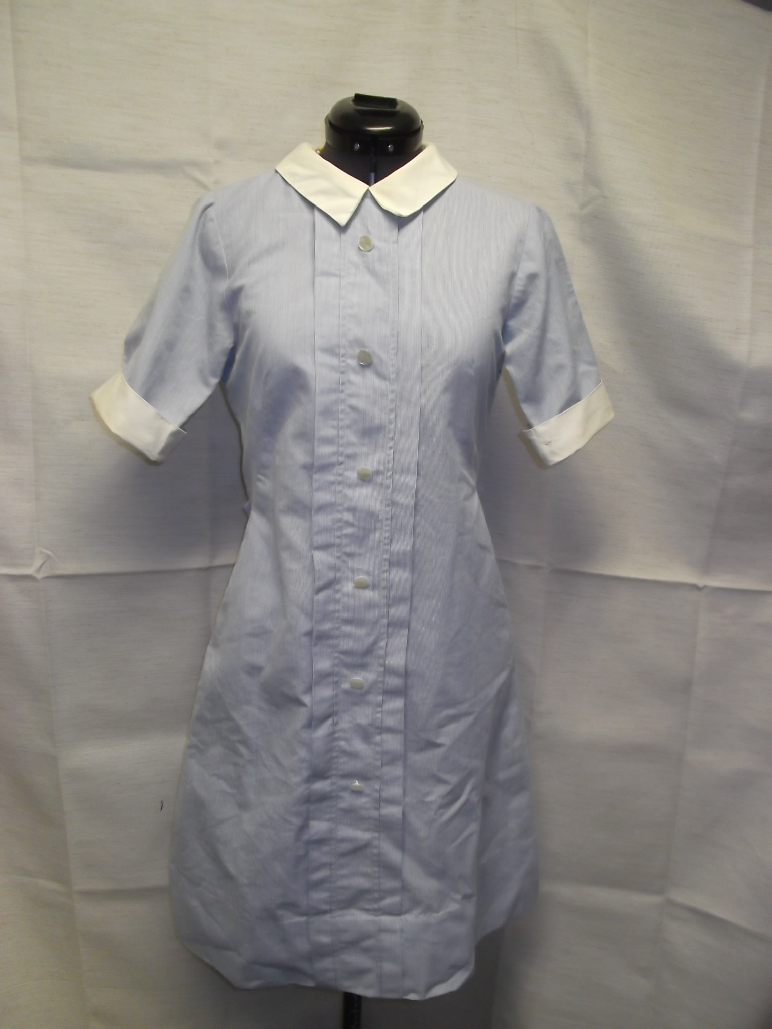 Fitted dress zips up front, which is covered with pleated button placket. White pointed collar and cuffs on SS. Button belt in back.; Chest-38; Waist-34