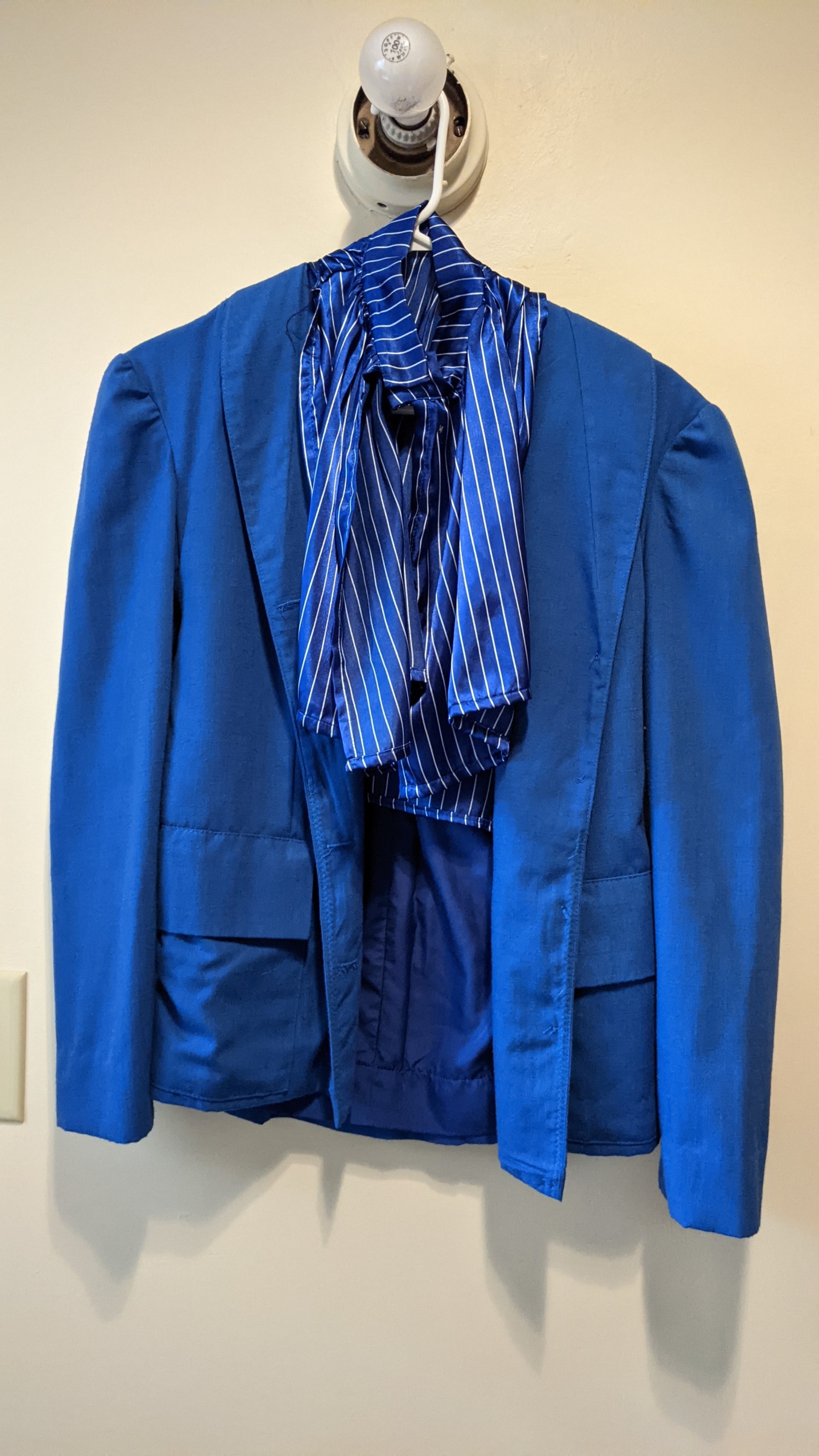 LS blazer, skirt, and collar piece; Chest-36; Waist-34; Skt Waist-28; Skt Hip-42; Skt Length-31