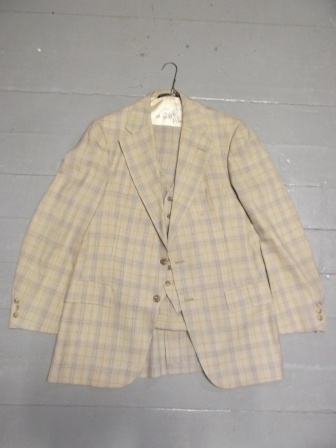 Jacket, pants, vest; plaid; Size-42; Coat Chest-44Coat Waist-42; Coat Hips-44; Coat Length-31; Vest Chest-42; Vest Waist-40; Pants Waist-34; Pants Hip-44; Pants Length-30