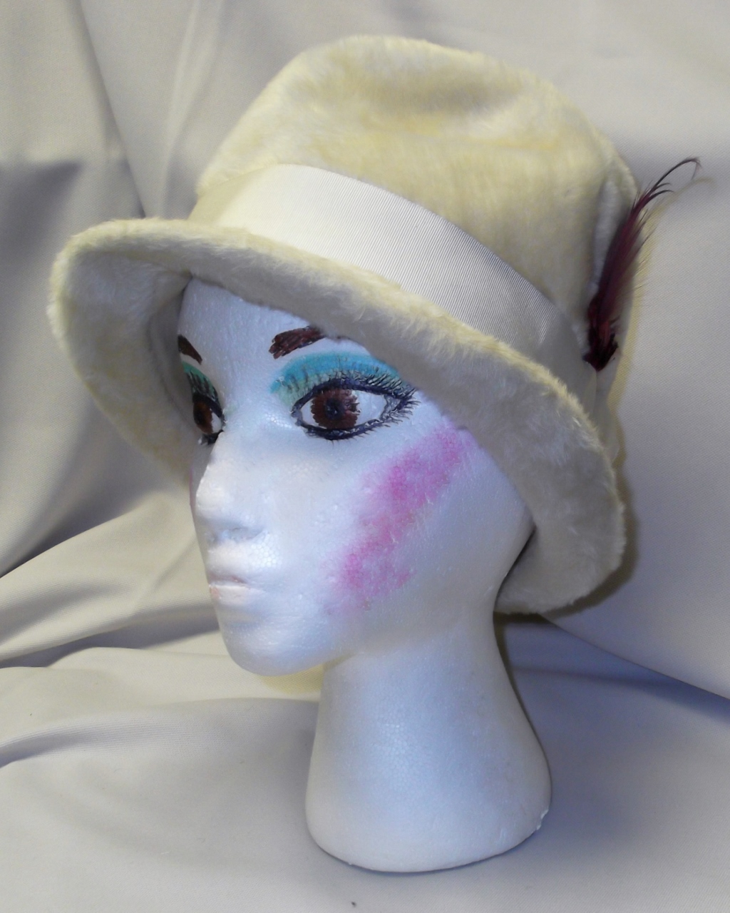 Cream; Fur hat with grosgrain ribbon hat band and feather for accent; Head Size-21; Hat Size-S
