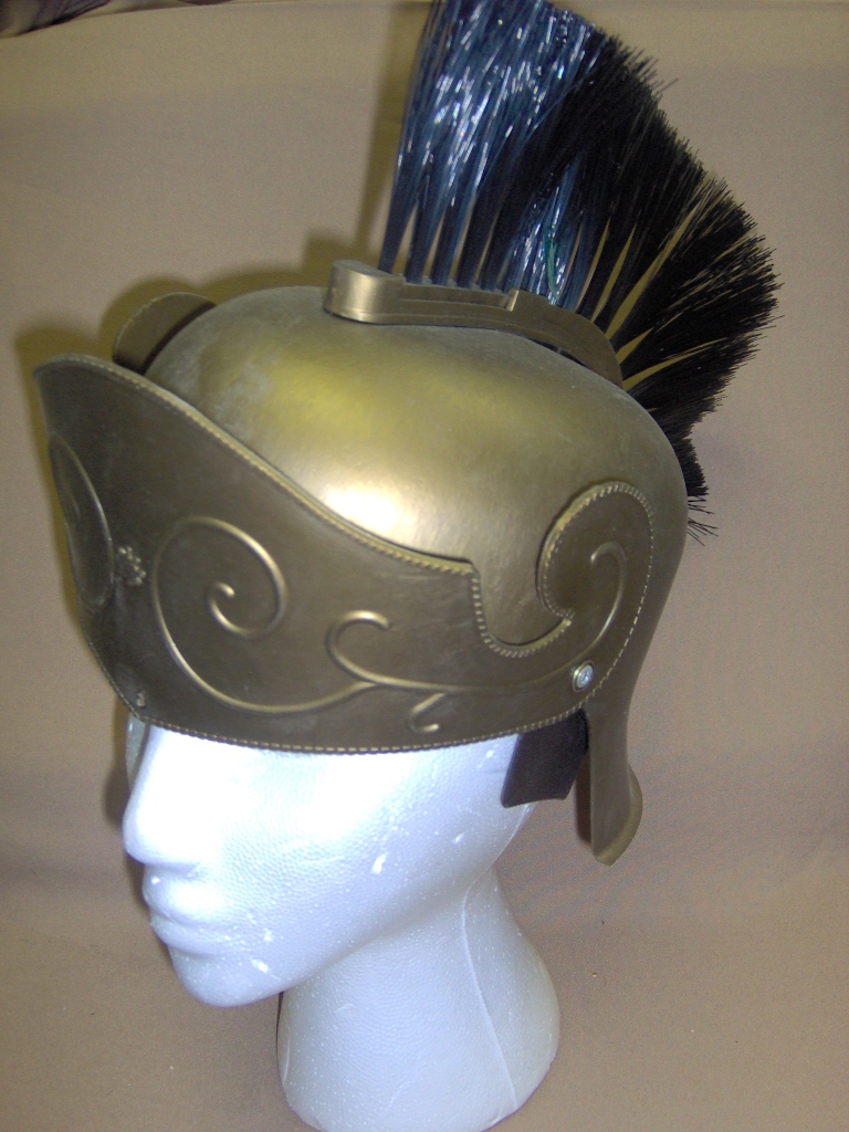 Gold and black; Gold Roman Centurion helmet with black plume; Head Size-One Size Fits All; Hat Size-One Size Fits All
