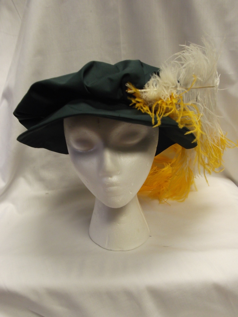 Green; Green round hat with yellow and white feathers.; Head Size-24; Hat Size-XL
