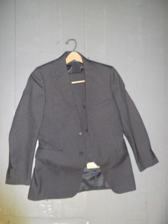 Pinstripe. Jacket, vest, and pants set. Quick change zipper in back of vest; Size-40; Coat Chest-42Coat Waist-38; Coat Hips-42; Coat Length-31; Vest Chest-38; Vest Waist-38; Pants Waist-32; Pants Hip-42; Pants Length-33