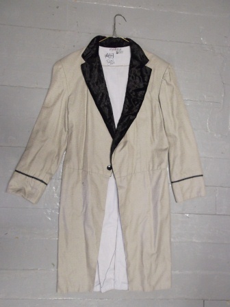 Frock coat has black velvet collar and lapels. Black buttons and black ribbon on sleeve cuffs.; Size-42; Coat Chest-44; Coat Waist-38; Coat Height-N/A; Coat Length-42; Pants Waist-N/A; Pants Length-N/A