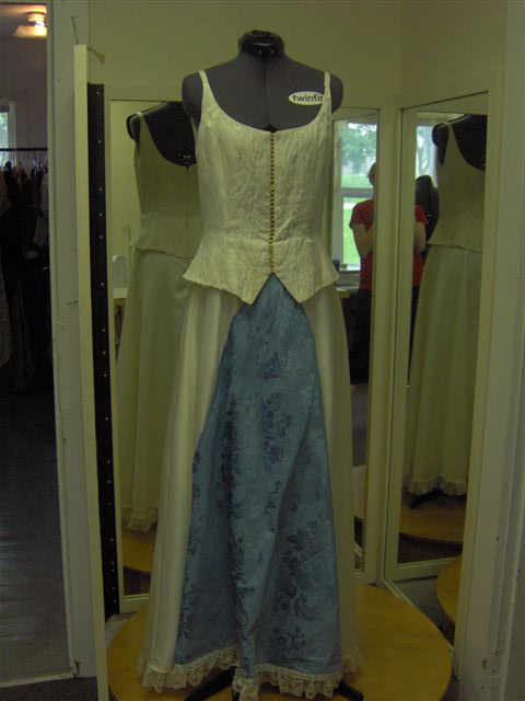 Ivory brocade mock lace-up vest with ivory satin skirt with blue brocade inset.; Chest-34; Waist-29; Hips-50; Length-59