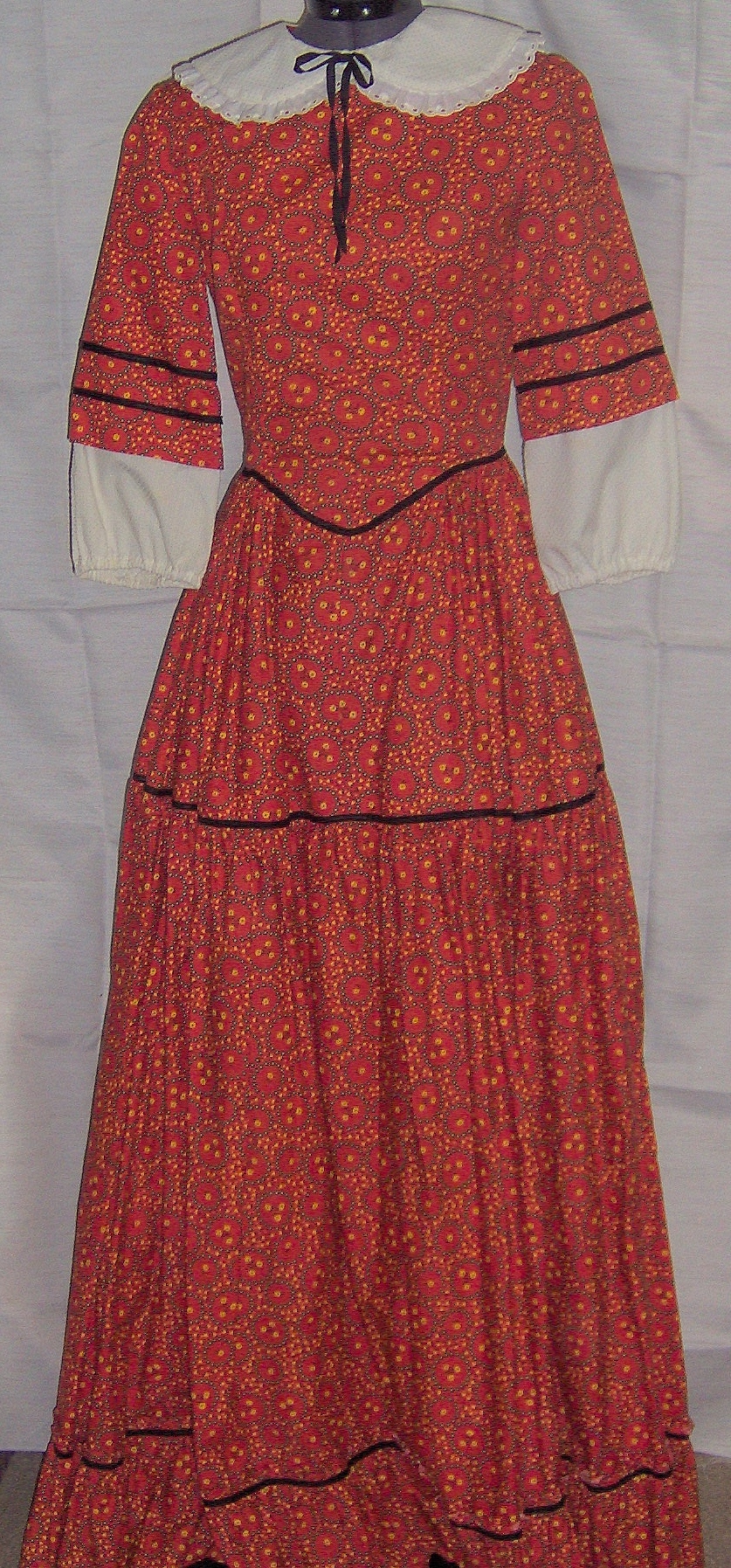 Calico jewel neckline with a large choirboy collar, 3/4 length set in over sleeve with a plain undersleeve that has an elastic cuff; Attached to a princess style fitted bodice with a drop waist front and a gathered tiered skirt. Accents of ribbon on over sleeves, waist, and skirt; Bust-33; Waist-25; Hip-59; Length-60; Sleeve Length-18