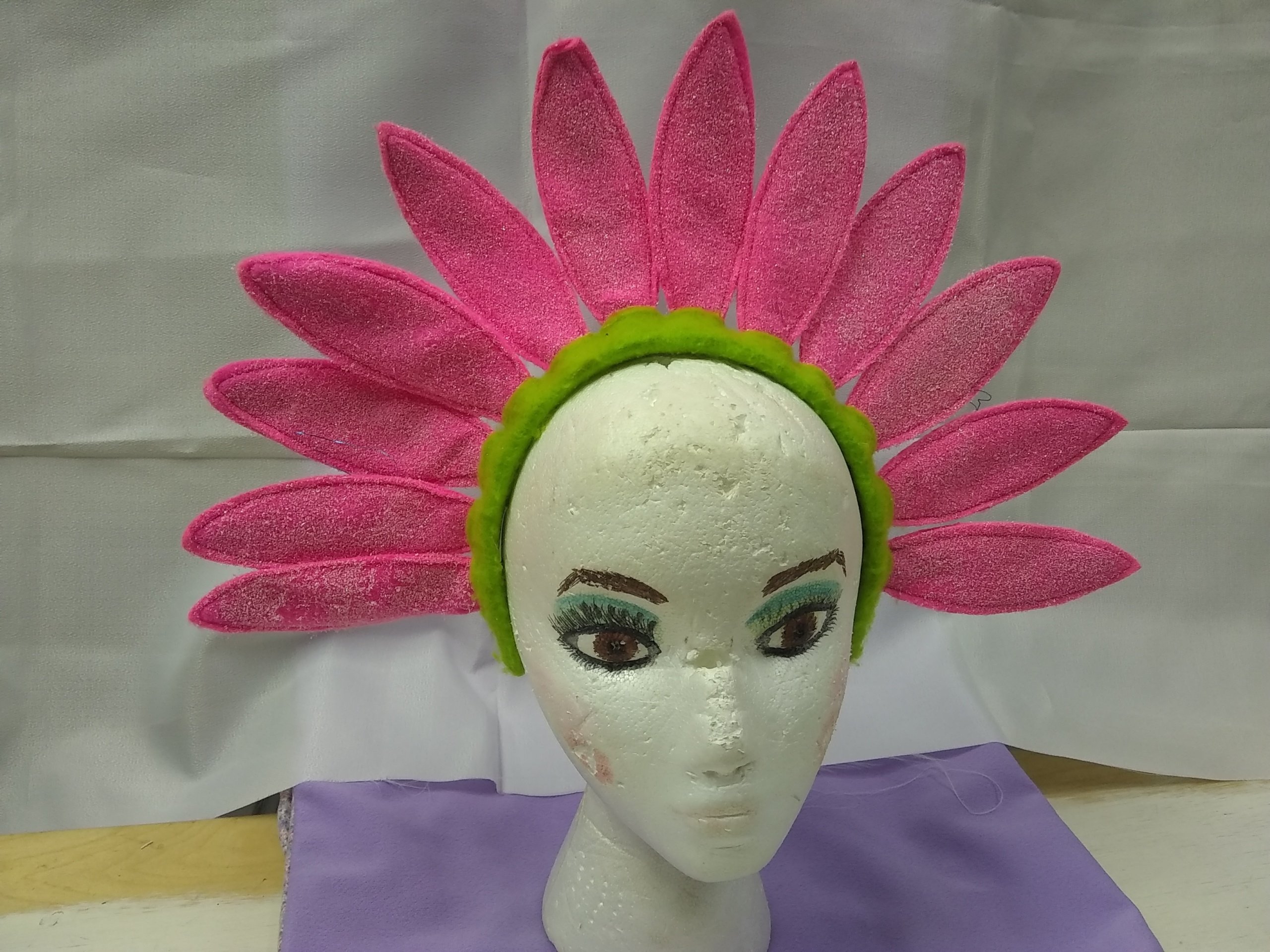 Pink and green; Pink flower headband with short thin petals and green headband.; Head Size-N/A; Hat Size-N/A