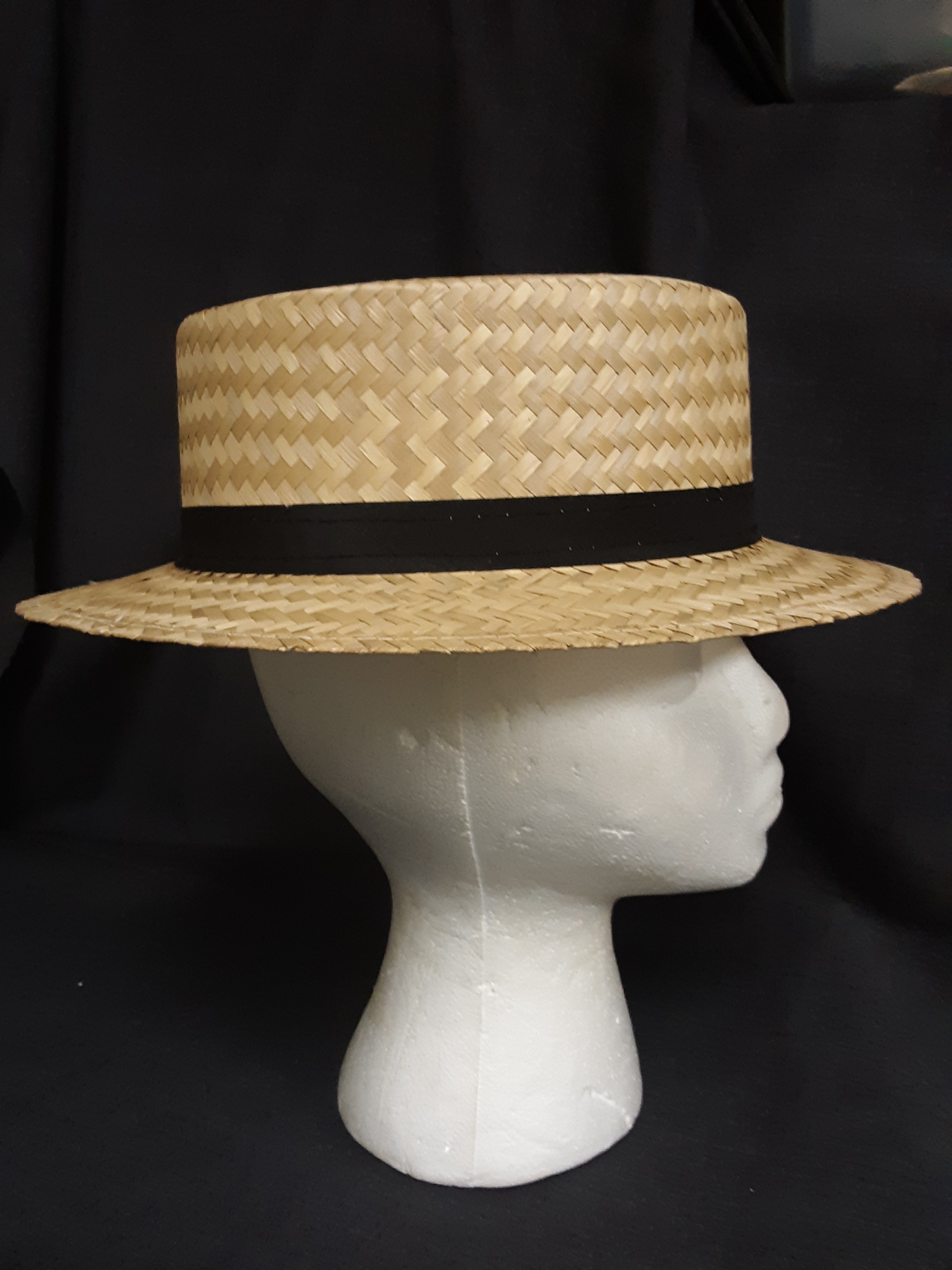 Pink; Tan boater style straw hat with black band. ; Head Size-22.5; Hat Size-M