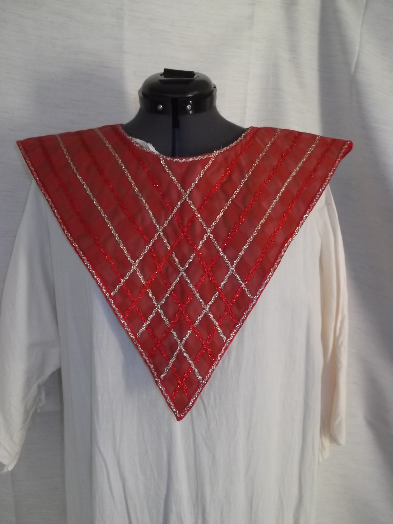Large, pointed collar with red and silver sequence over front and silver trim.