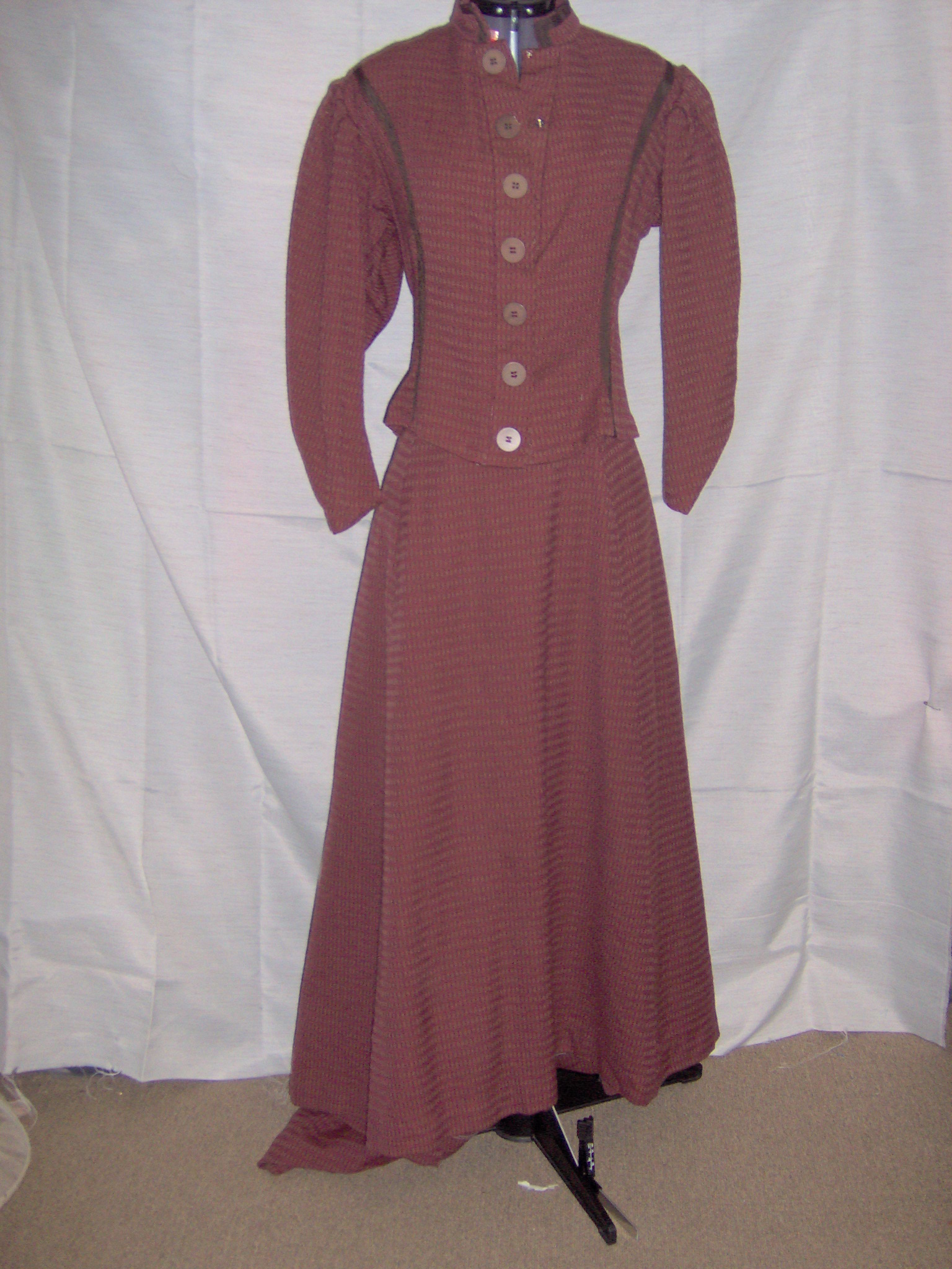 Red and brown print. Brown buttons. Brown ribbon trim. 3 piece. ; Bust-40; Jacket Waist-40; Jacket Hips-48; Sleeve Length-; Skirt Waist-40; Skirt Hips-48; Skirt Length-
