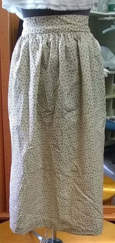 Small flower print; knee-length apron; Length-34; Waist w/o ties-18; Waist with ties-91