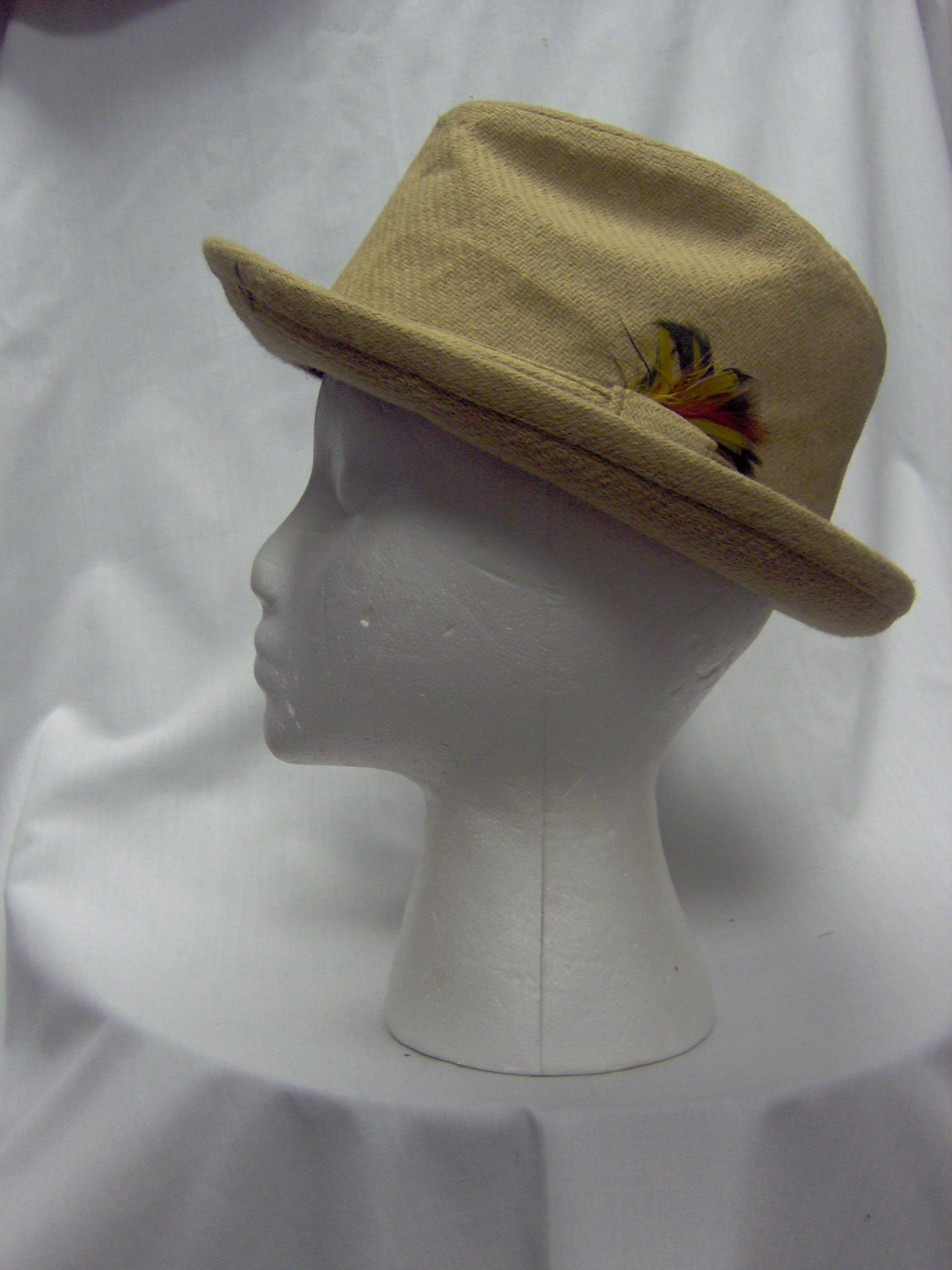 Tan; Tan wool fedora with feather in band.; Head Size-21.5; Hat Size-S
