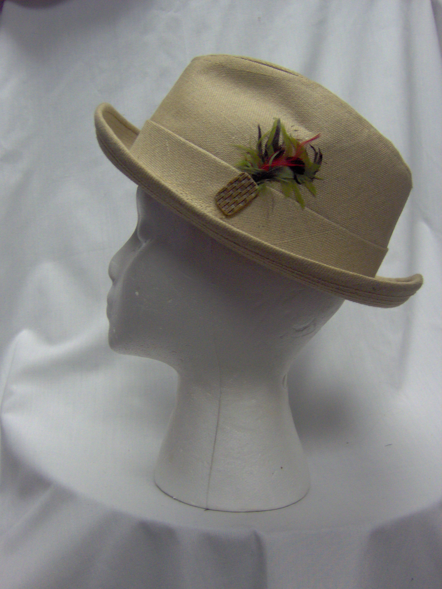 Tan; Tan linen fedora with feather in band.; Head Size-22; Hat Size-M