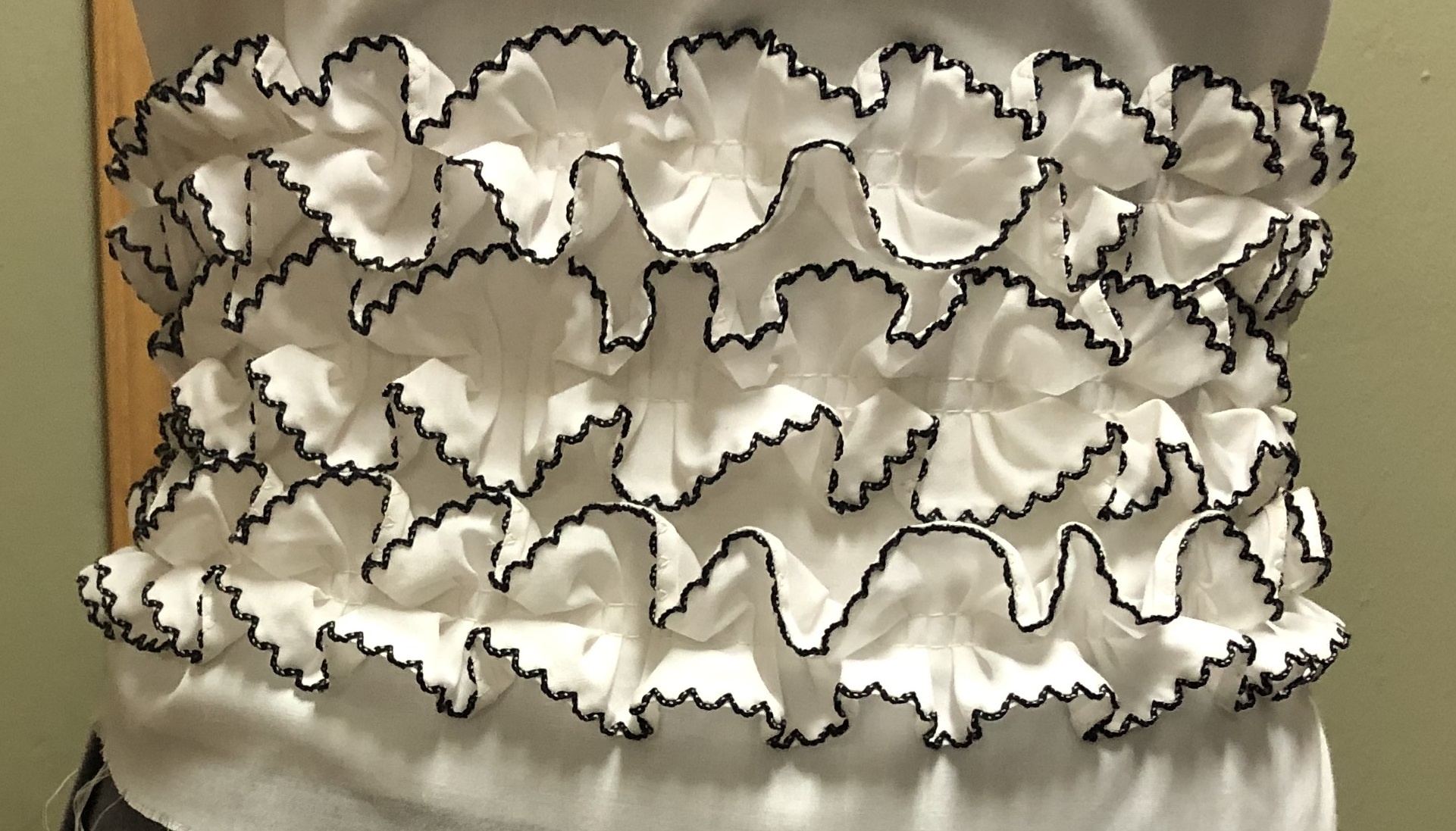 Ruffled front, no back or waist; Waist (max)-N/A; Waist (min)-N/A
