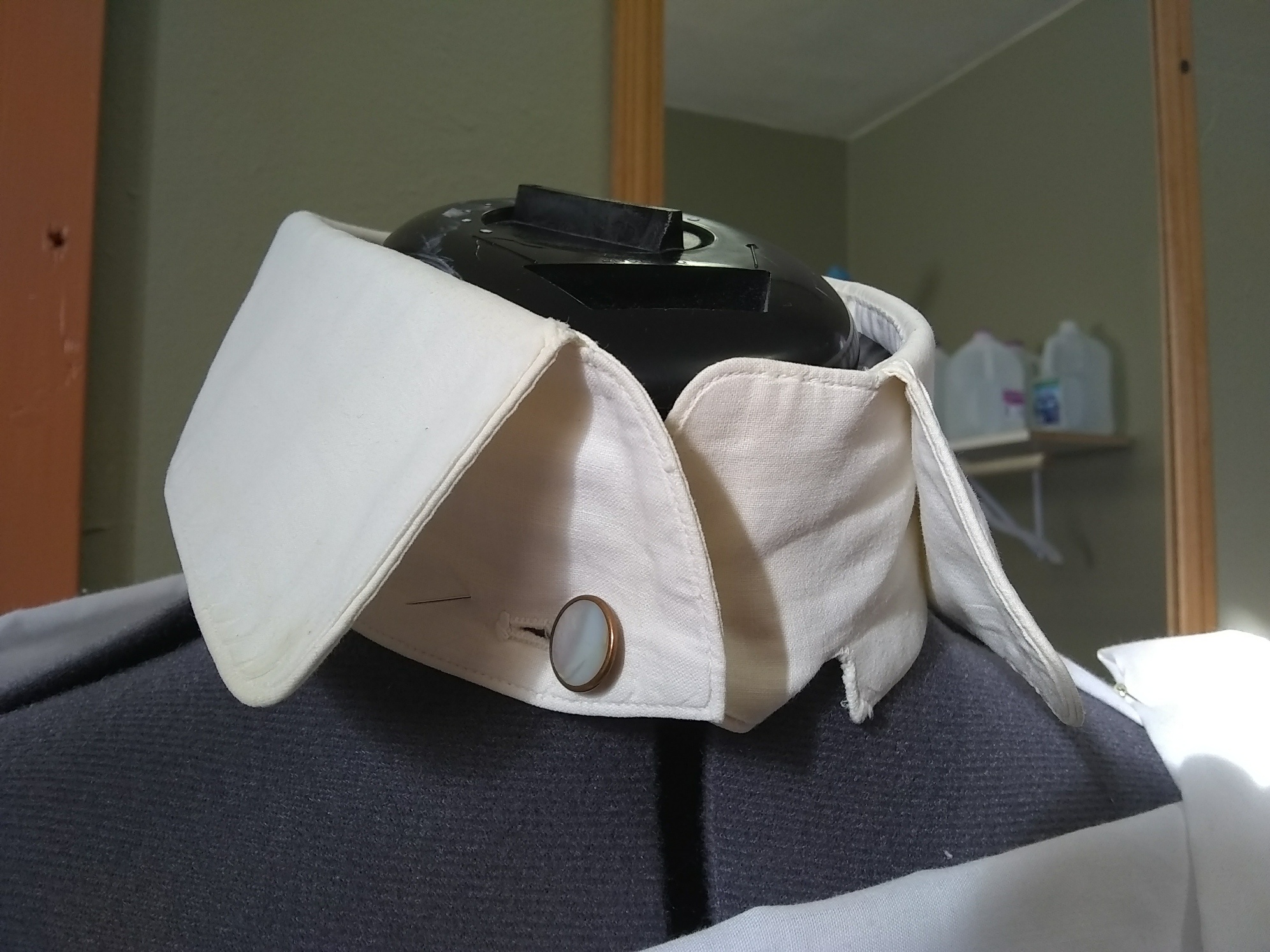 Thin wrap-around collar with decorative button in center; Collar Clasp-Pin clasp