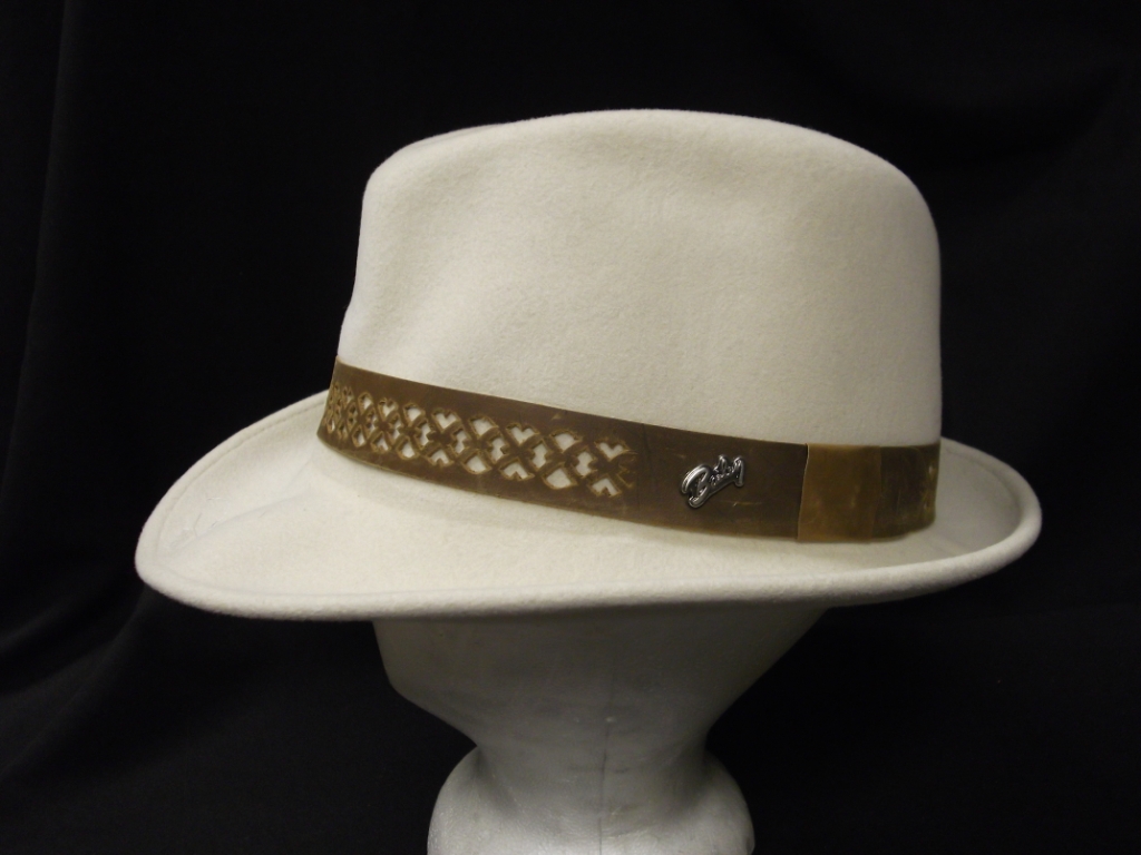 White; White wool felt fedora style hat with brown hat band.; Head Size-23; Hat Size-L