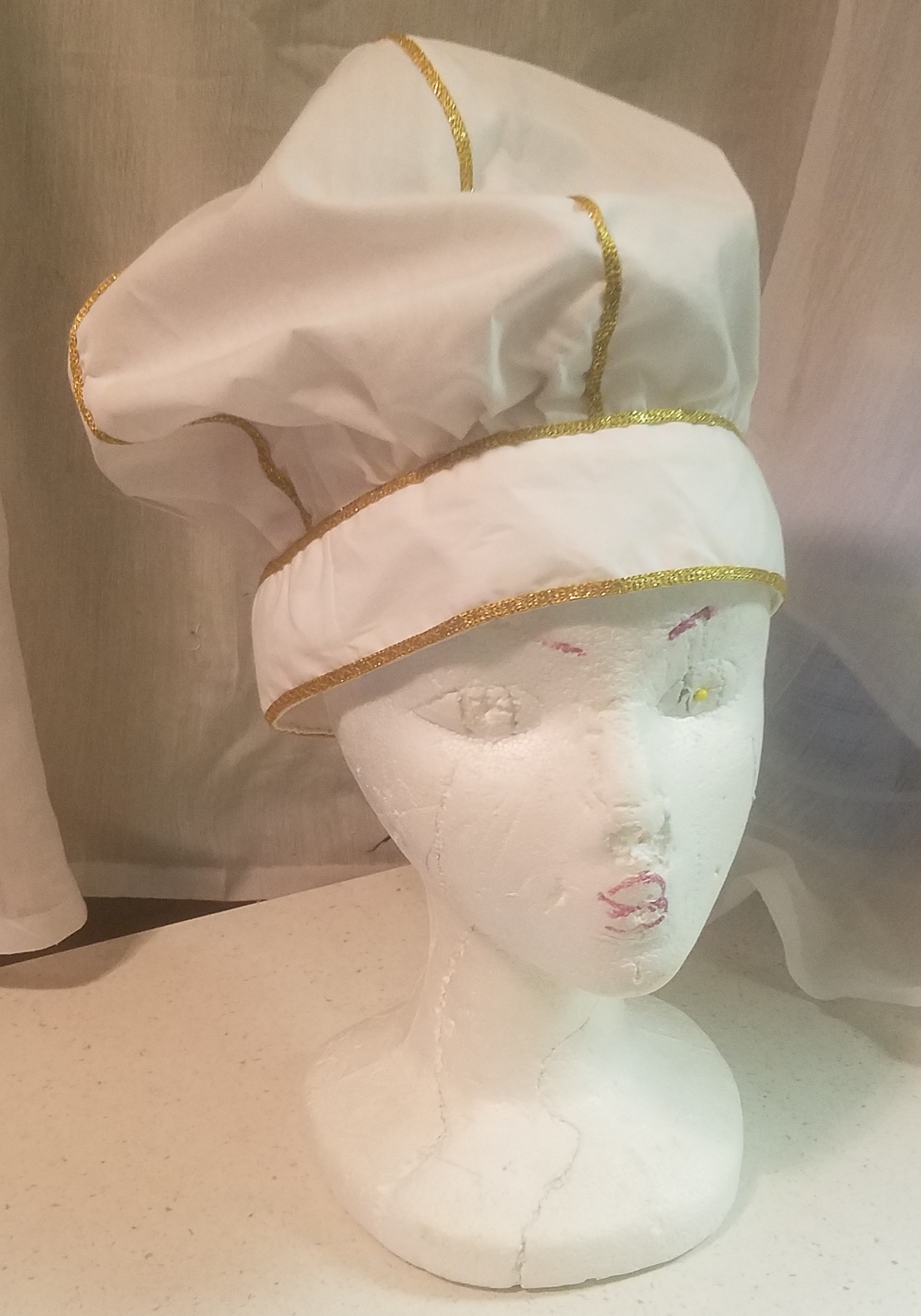white, gold; adjustable chef/baker hat; cotton poly fabric with gold trim; Toque/chef; Head Size-One Size Fits All; Hat Size-One Size Fits All