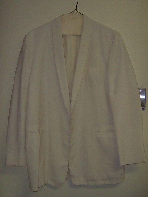 Jacket only; single button; stains on back and sleeves; Size-40; Coat Chest-42Coat Waist-40; Coat Hips-42; Coat Length-30; Vest Chest-N/A; Vest Waist-N/A; Pants Waist-N/A; Pants Hip-N/A; Pants Length-N/A