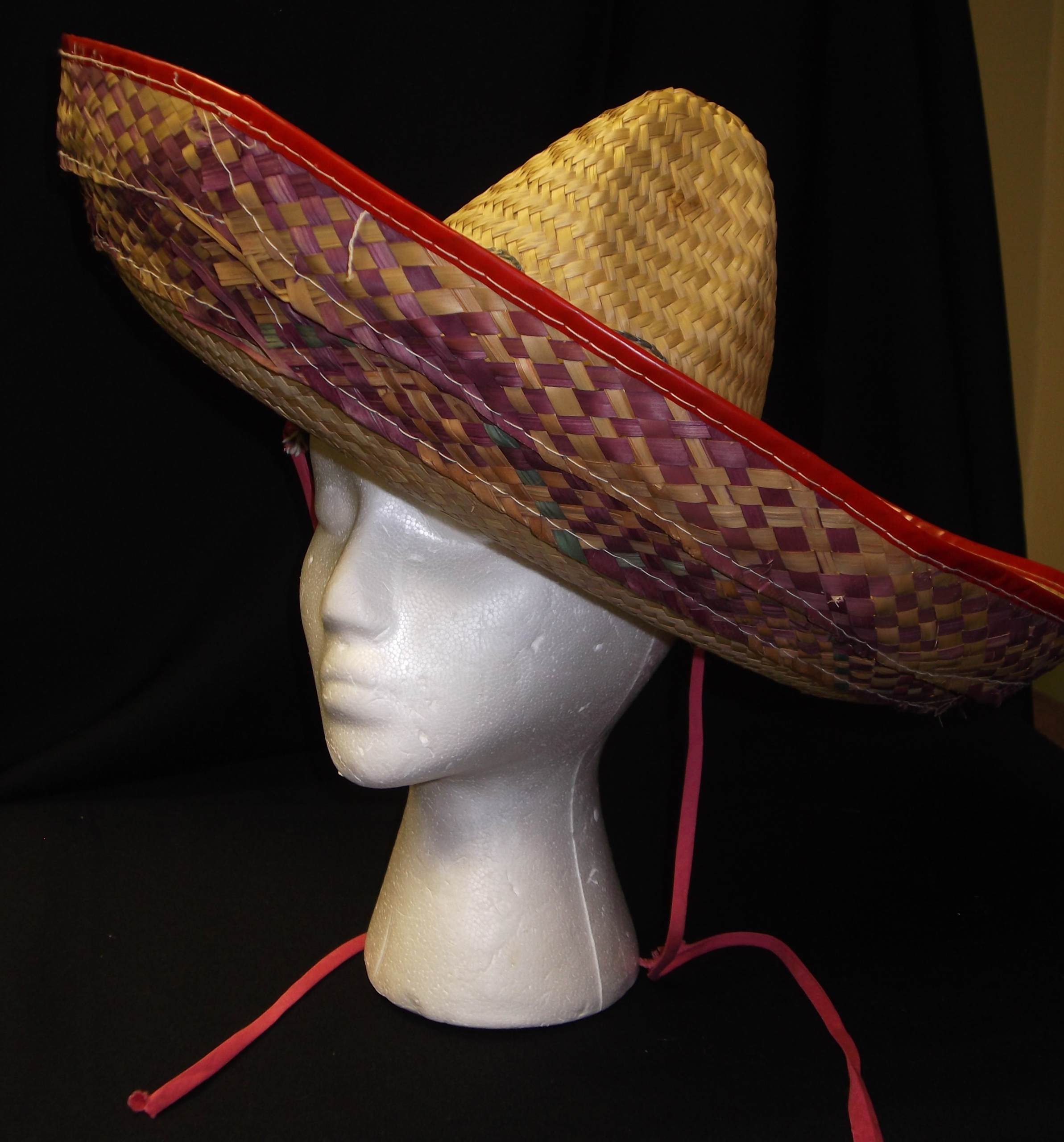 Yellow, purple, and pink; Straw sombrero with red binding and purple colored straw and blue embroidery; Head Size-22; Hat Size-M